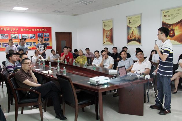 图1、中国十大娱乐赌博城网址抛光砖副总司理张彦亲自向导销售团队加入微信、微博、手机版官网培训